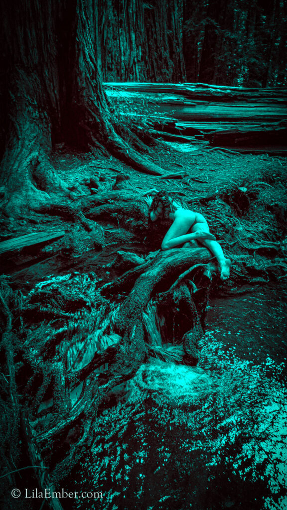 Naked woman in a redwood forest tucked into giant roots